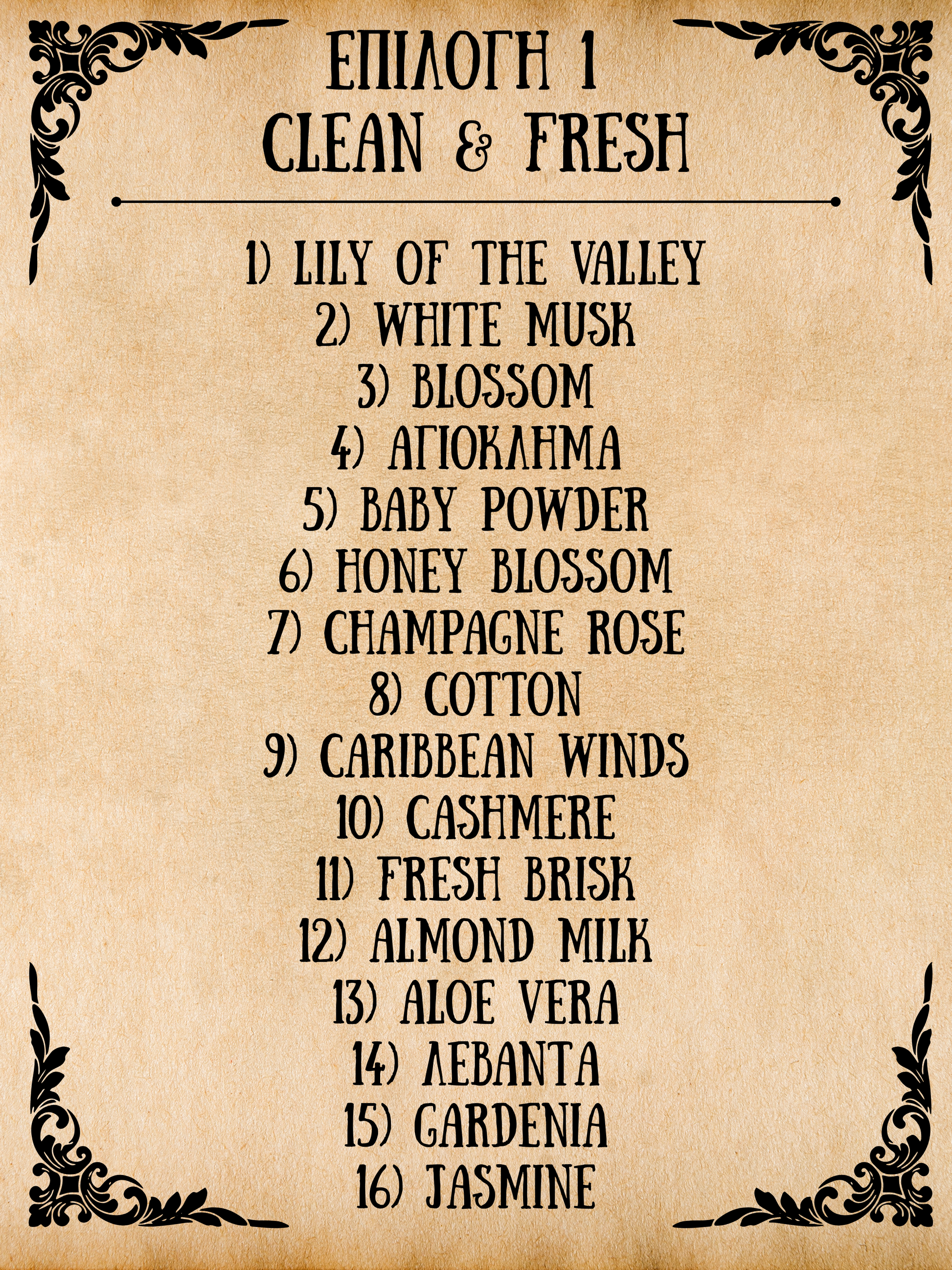 1)Lily of the Valley, 2)White Musk, 3)Blossom, 4)Αγιόκλημα,